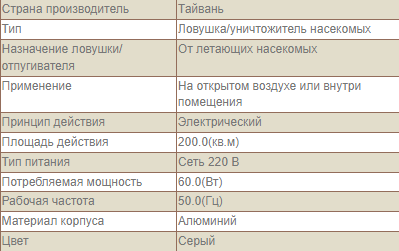 Материал инсектокутора: алюминий и ABS. Питание: от бытовой сети 220-240В (50-60 Гц). Источник ульрафиолета: 3 УФ-лампы по 20 Вт каждая. Средняя продолжительность работы Ультрафиолетовой лампы 8000 - 10000 часов. Потребляемая мощность: 60 Вт. Рекомендуемая площадь защиты: до 200 м². Размеры: 646*100*360 мм. В комплекте: уничтожитель – 1 шт., прочная цепочка для подвеса - 1 шт., русскоязычная инструкция – 1 шт.