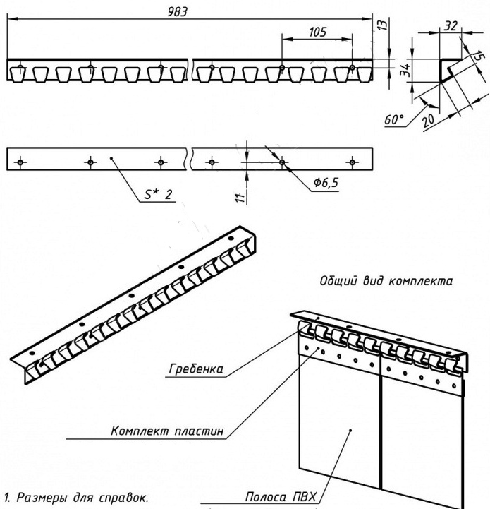 Гребенка используется для монтажа ПВХ завес в проёме. Использование специального крепления позволяет обеспечить равномерный износ лент, производя замену лент с центральных областей проема на крайние боковые. Удобный и простой монтаж ленточных завес осуществляется без применения специального инструмента. Карниз может быть закреплен как внутри проема, так и над ним.